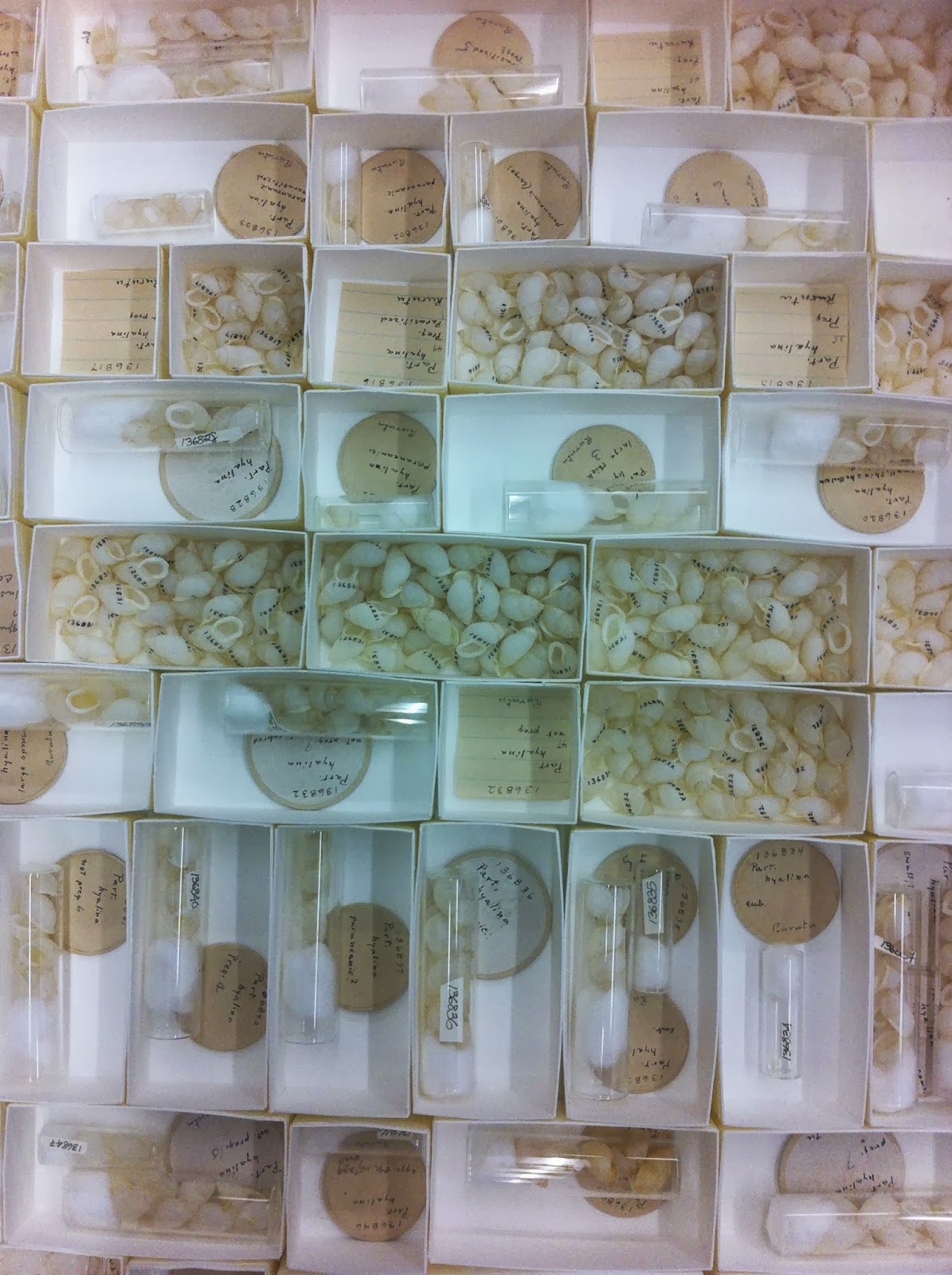 Finally we made our way to the Malacology Department. A gentleman there explained the distribution of land snails in Polynesia and how they can be used to tell what the environment was like during the snail's lifetime. The smallest and most abundant ones were able to be carried by birds across the ocean. But one species seems to have been able to be found on only a select few islands across the Pacific and suggested human distribution...
